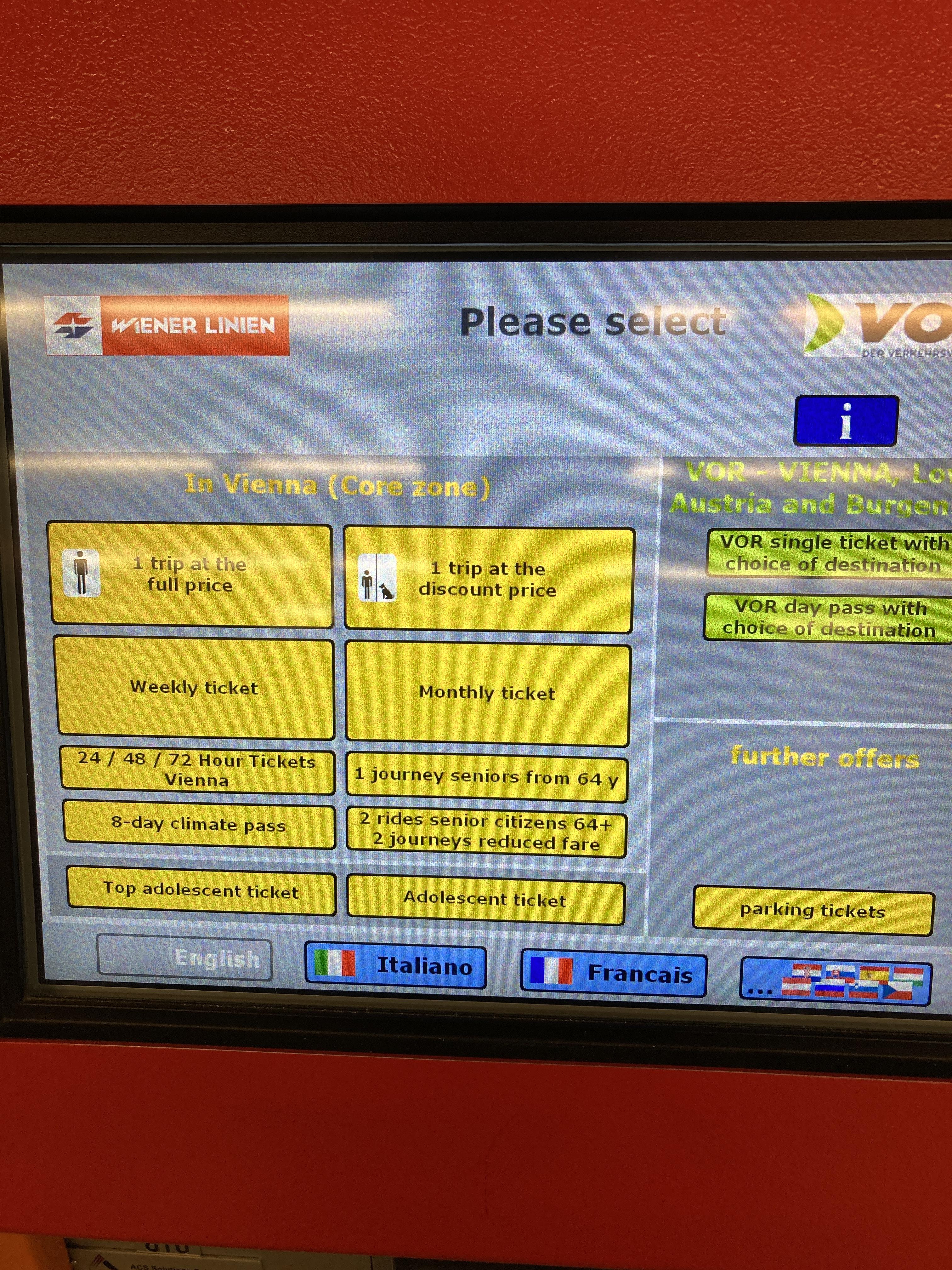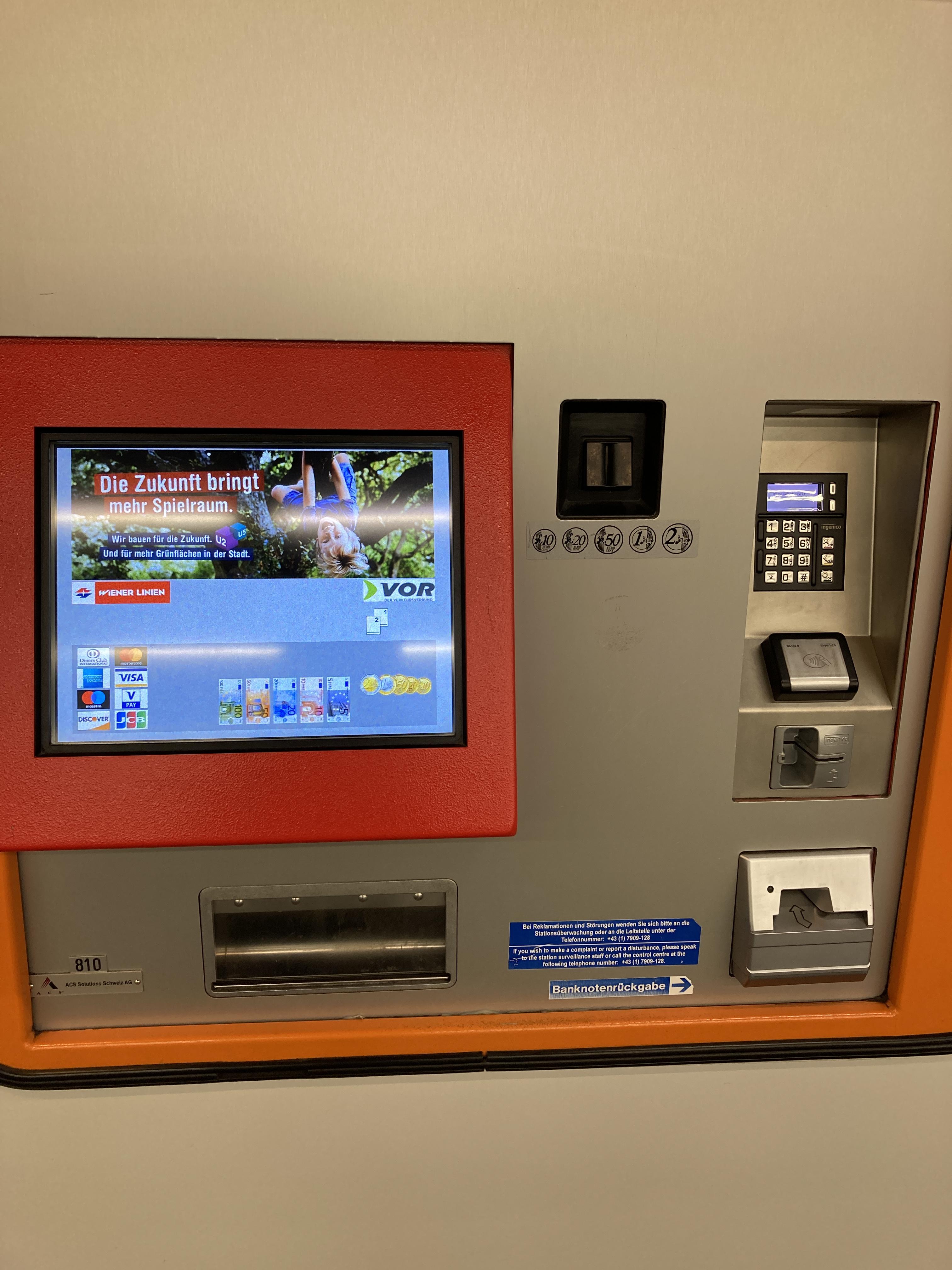 비엔나 교통권은 보통 지하철의 입구에서 아래 사진에서 보여지는 같은 기계에서 자동으로 구매할 수 있습니다. 독일어로 적어져 있지만, 영어로 언어를 선택해서 볼 수 있습니다. 티켓 결제는 현금뿐 아니라 카드도 이용이 가능합니다.